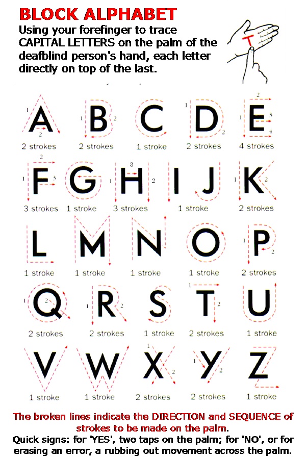 For those who are severely or profoundly deaf, there will be a need to rely exclusively on tactile communication methods. The deafblind block alphabet can be a useful first step for establishing tactile communication with a deafblind person. A video demonstration of the block alphabet from Deafblind Enablement can be found on YouTube and a printable version of the block alphabet can be downloaded. The British Sign Language alphabet has been adapted to present a version suitable for tactile communication with deafblind people, known as the deafblind manual alphabet, or perhaps more clearly, as the deafblind fingerspelling alphabet. There is a Deafblind Enablement video of a deafblind person teaching a hearing-sighted person the deafblind fingerspelling alphabet on YouTube and a printable version of the deafblind fingerspelling alphabet can be downloaded. Deaf people who used BSL earlier on before becoming deafblind may use alternative methods such as hands-on signing or visual frame signing. These alternative deafblind communication methods are summarised on the Sense website.
